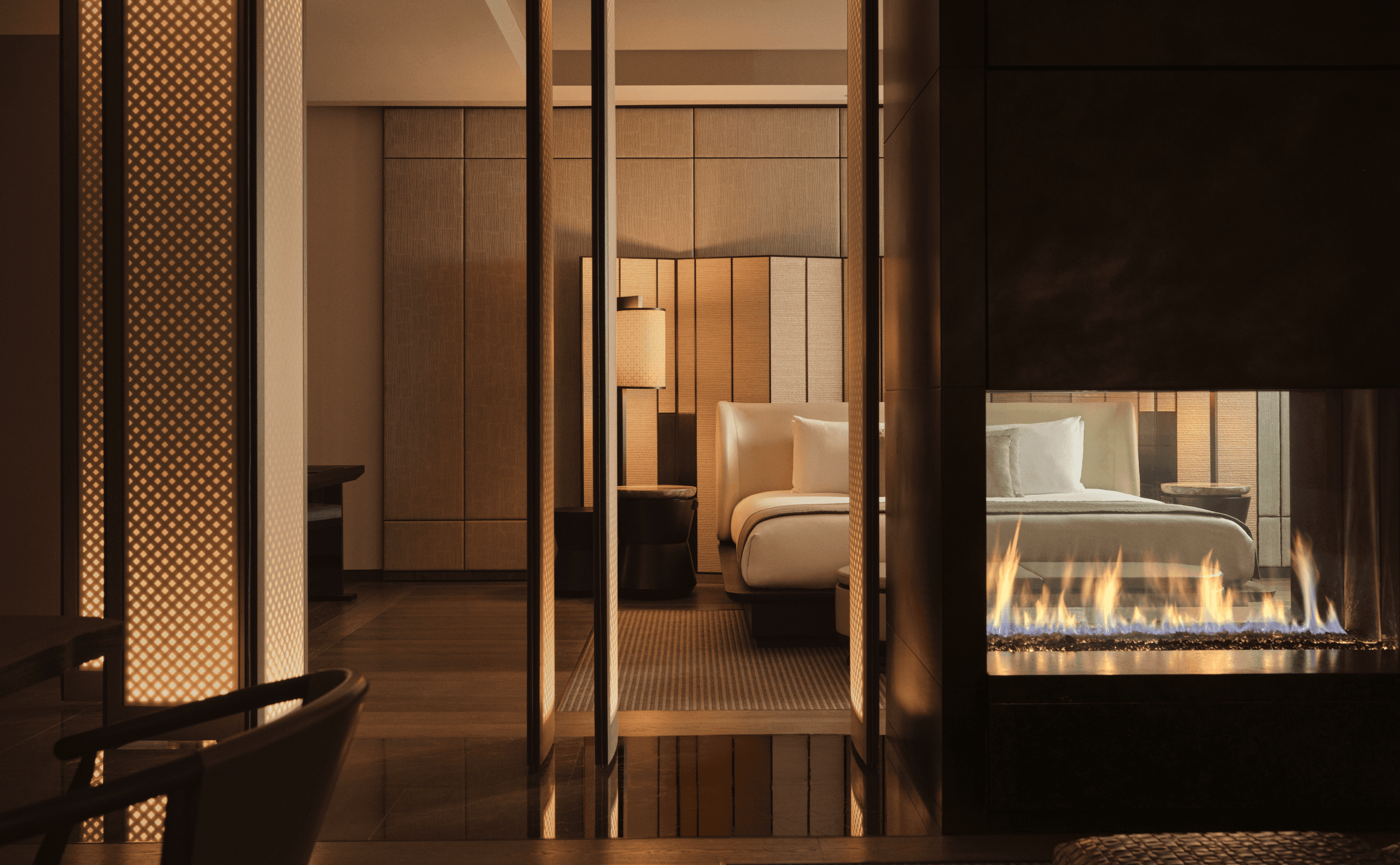 All 83 suites follow the same template: fireplace, Tohaku mural, oversized bathroom with soaking tub and rain shower, double vanities, complimentary minibar, butler service. The differences are size, view, and layout. Deluxe Suites (720 sqft) are the entry level and are genuinely spacious, but they function as large studio rooms, not true suites with separate living areas. The upgrade to a Corner Suite or Premier Suite gets you more window exposure and breathing room but not a separate bedroom. If you want a true living room/bedroom separation, you need to jump to the One-Bedroom Home or higher. This is the biggest booking insight: the mid-tier categories (Fifth Avenue Suite, Grand Suite) add bathroom square footage and marginally better views, but not a fundamentally different room experience. I'd either book the Deluxe Suite and spend on the spa, or go straight to a One-Bedroom Home. The middle tiers are a dead zone.