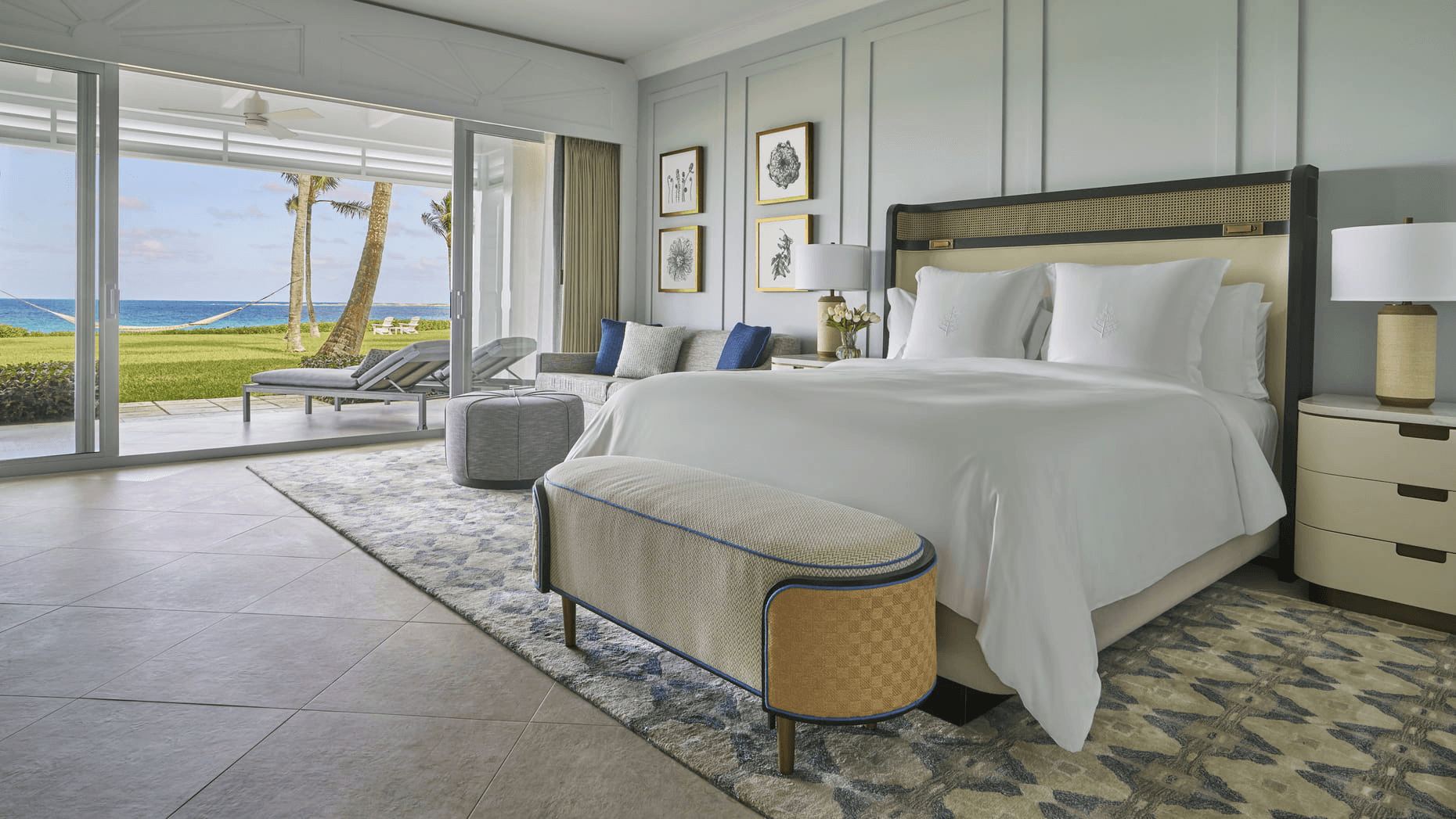 Two wings, different personalities. The Hartford Wing is the original 1962 building, recently renovated with enlarged rooms and suites by Jeffrey Beers. These feel fresher and more modern despite being the older structure. Garden View and Ocean View rooms, plus two- and three-bedroom ocean-facing suites. The Crescent Wing was designed by Adam D. Tihany with a more contemporary Bahamian beach aesthetic: aqua and sand tones, bamboo accents, louvered doors opening to balconies with ocean views. I'd book an Ocean View room in the Hartford Wing for couples (better renovation, closer to the gardens and DUNE) or a Crescent Wing beachfront room if proximity to the infinity pool and sand matters more. For families, the Two-Bedroom Plunge Pool Bungalows (enclosed courtyard, private plunge pool, two bedrooms each with its own bathroom) are the sweet spot: private, spacious, and recently renovated. The Villa Residences (three and four bedrooms, private infinity pools, full kitchens, 24-hour butler teams) are extraordinary for multi-gen groups and worth every bit of the premium.