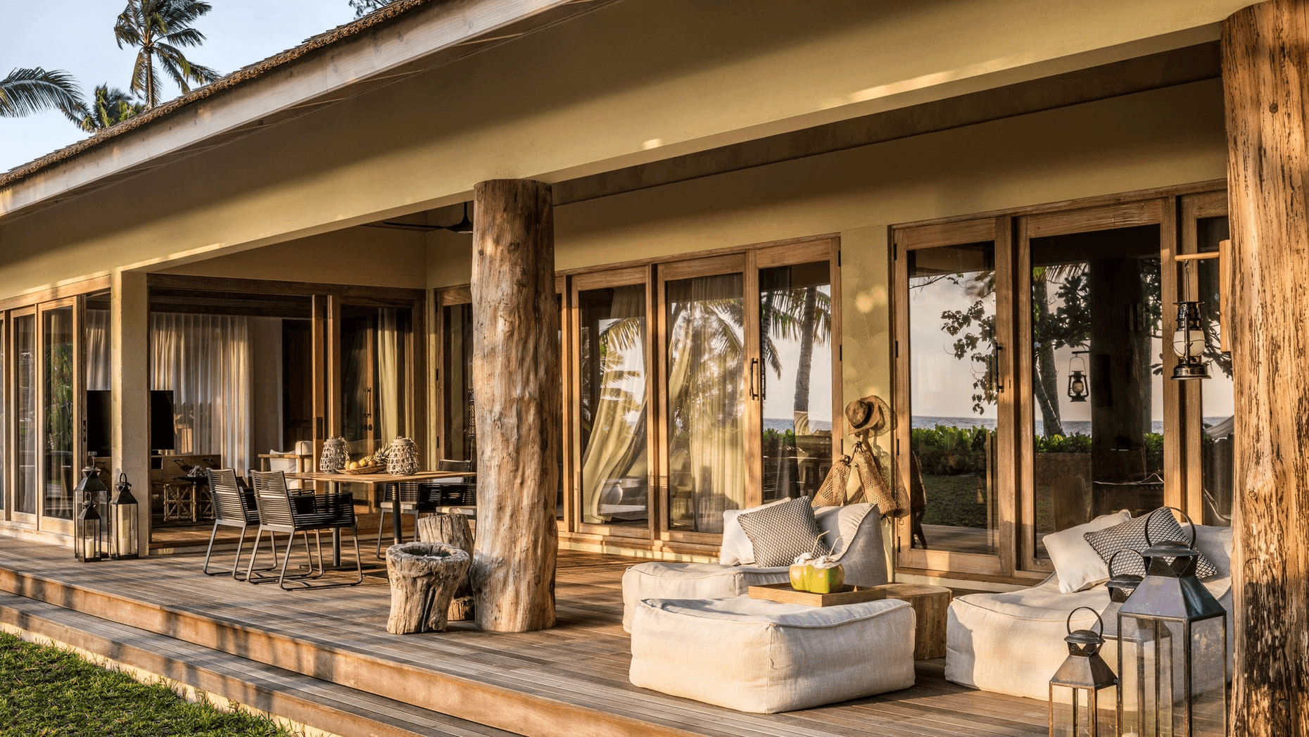 Every room has a private pool and beach access, which simplifies the decision. Ocean-View Pool Villas are the starting category and already generous: roughly 2,000 square feet of indoor-outdoor space, four-poster bed, outdoor shower, plunge pool, private garden leading to the sand. Request a villa on the north beach for calmer water and better swimming; the south side faces the open ocean with more wave action. Sunset Beach Villas face west and are worth the upgrade for the daily sunset from your terrace. Sunset Beach Suites add a second sleeping area for families. For groups, the Residence Villas (3-7 bedrooms) sit across the airstrip on the quieter eastern part of the island with full kitchens, dedicated butlers, and even more seclusion. The Seven-Bedroom Presidential Villa has three pools, its own gym, and can sleep 16.
