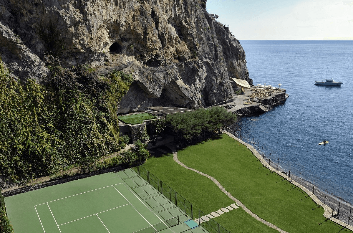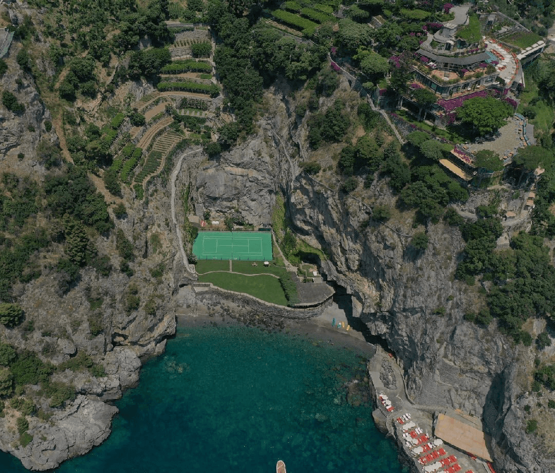 The private beach is the single biggest differentiator from every other hotel on the coast. An elevator blasted through 88 meters of cliff rock drops you to a natural cove with a sunbathing platform, the Carlino restaurant, a bar, kayaks, and paddleboards. The tennis court sits right at sea level between the cliffs. It's exclusively for hotel guests. The pool is higher up on the property, semicircular, with views toward Capri. It has underwater music, which sounds gimmicky but is actually a lovely touch when you're floating. From June through September, the hotel runs a complimentary two-hour boat cruise along the coast, and a private yacht is available for charter.
