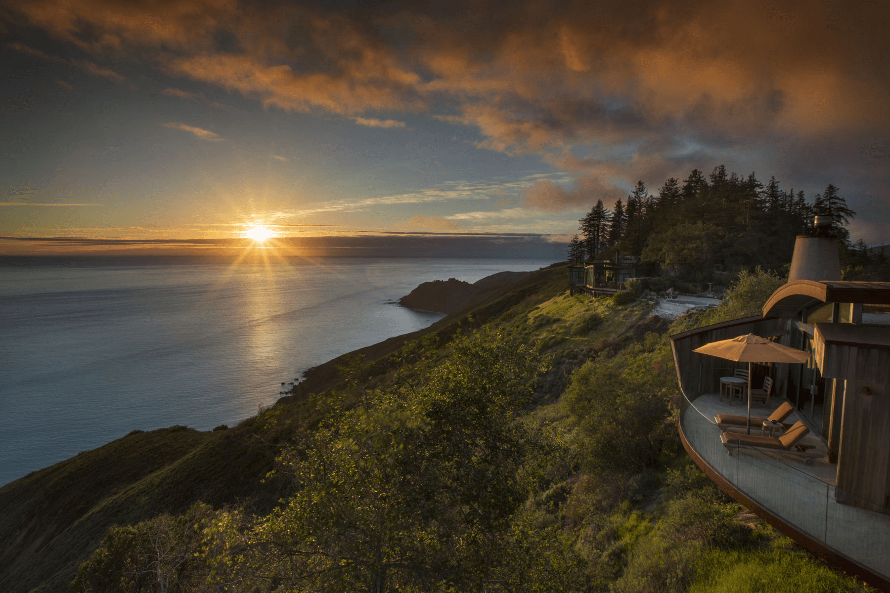 Architecture, nature, and stillness. 40 rooms designed by Mickey Muennig across a ridgeline 1,200 feet above the ocean, between redwoods and the Pacific. No TVs, no alarm clocks, no children under 18 in rooms. Opened in 1992 on a former homestead. Sierra Mar restaurant holds a Wine Spectator Grand Award. Three Michelin Keys (accommodation). Complimentary breakfast, minibar, yoga, guided hikes, stargazing, meditation, and a fleet of Lexus vehicles for guest use. Two heated cliff-edge infinity pools, one lap pool. On-site spa with a shaman. Open year-round.