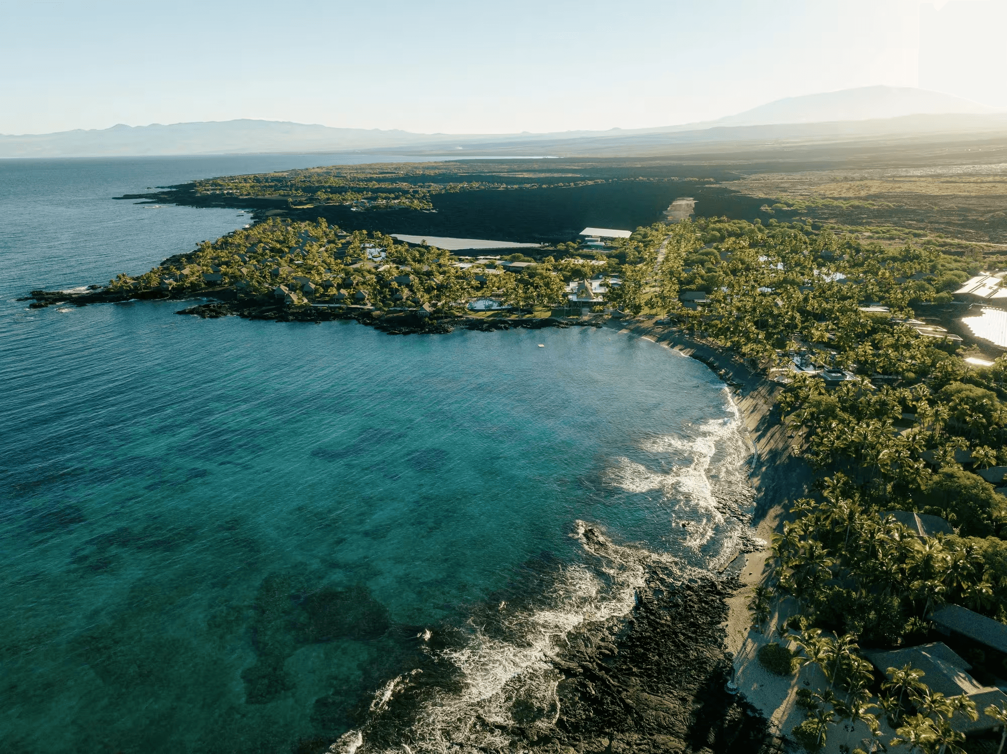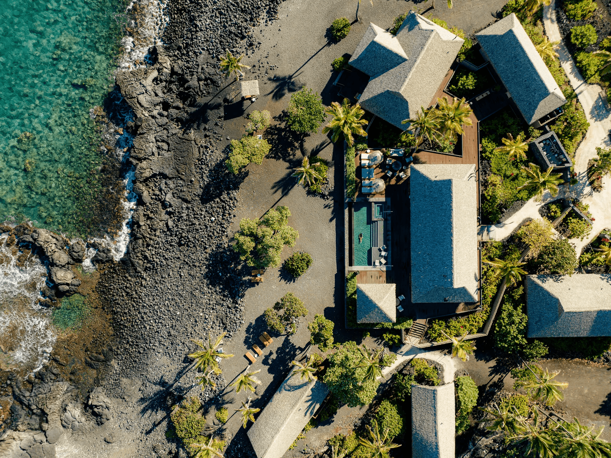 Less than you'd think logistically, more than you'd think experientially. The airport is 15 minutes. Four Seasons Hualalai is a 5-minute drive. Kailua-Kona town is 25–30 minutes. But once on property, the 81 acres of lava fields, lagoons, and palm groves create genuine seclusion. No foot traffic from outside.